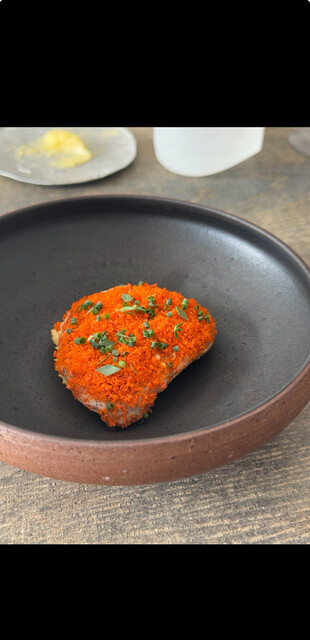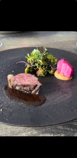 太刀魚の切り身は角ばって整い、降り注ぐ陽光に銀鱗がまだ残っているかのよう。魚自体の品質も良く、口当たりが良い。立山黒部の渓谷を泳ぎ抜いてきたかのような、食卓に届く一瞬の甘みだ。薄切りの月牙状の熊の腿肉は、野趣あふれるギビエ・ミヤマのような野生の味わいには及ばず、熊の脂が長年染み込み、油脂が筋肉の繊維にまで絡み合うような絶妙さは感じられなかった。おそらく調味がバランスと繊細さを追求しすぎて、野性味が足りないため、風味が少し物足りない。