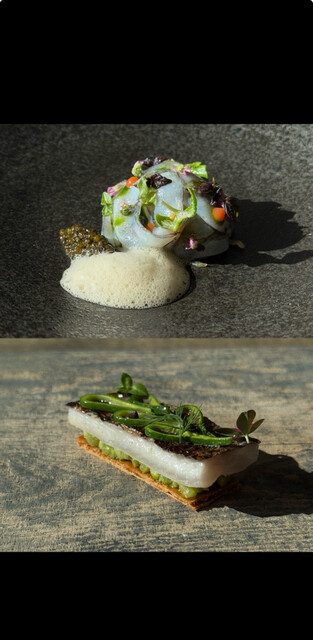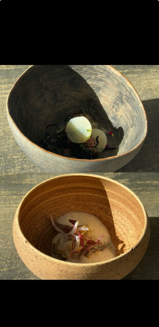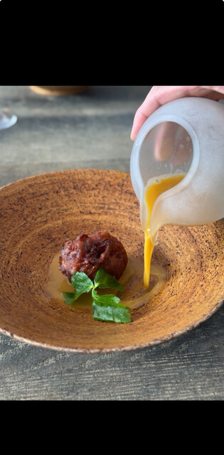 店の香箱蟹は、近来食べた中で最も控えめな味わいだったが、羊脂玉のような上品な鮮味が眉を上げるほどで、コシヒカリの米漿もほんのり濃厚さを添えている。素麺も美味であり、スープは山羊のチーズと鶏の澄まし汁を調和させたもの。山渓の清らかな冷たさと竈の火の温かさが同時に喉を駆け抜ける。能楽の一幕のように、上品で、琥珀の液体から差す幾筋かの金色の光のようだ。穴子の身は、まるで愛する人の手のひらのように柔らかく感じられる。