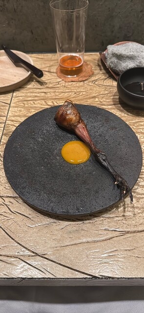 太刀魚の切り身は角ばって整い、降り注ぐ陽光に銀鱗がまだ残っているかのよう。魚自体の品質も良く、口当たりが良い。立山黒部の渓谷を泳ぎ抜いてきたかのような、食卓に届く一瞬の甘みだ。薄切りの月牙状の熊の腿肉は、野趣あふれるギビエ・ミヤマのような野生の味わいには及ばず、熊の脂が長年染み込み、油脂が筋肉の...