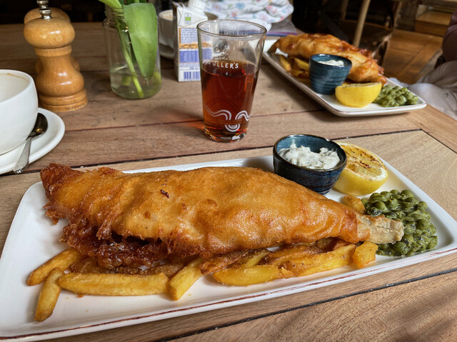 イギリスに来たからには一度はフィッシュアンドチップスを食べなくちゃということで、これを注文。メニューには「FULLER'S FRONTIER BATTERED HADDOCK」と書かれています。£17(今は円安で1ポンド166円ぐらいなので2,800円にもなります)。