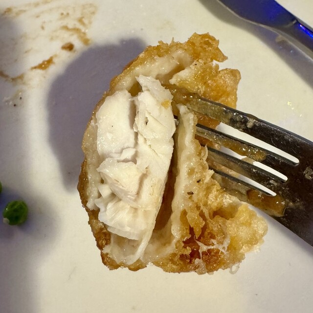 普通に魚料理を注文しようとしてこちらを指定しましたが、「Haddockって魚ですよね?」と店員さんに訊いたら、「あぁ、フィッシュ&チップスね」と言われてしまいました(笑)。そこまで読み取れるのかな、この英語。まあ「フィッシュ&チップス」でも私は全く問題ないので、そのまま注文しました。今回の旅行で2回目の「フィッシュ&チップス」です。肉厚でおいしい魚でした。