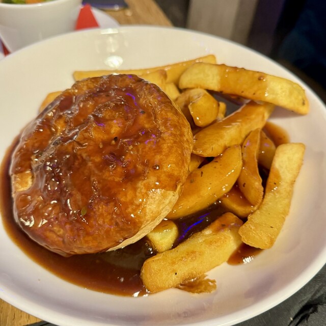 ステーキ肉なら息子が食べられるかな、と思ってこちらを注文。ステーキ肉入ったパイとポテトフライの上からグレービーソースがかかった豪快な料理でした。息子は、ステーキ肉のみをピンポイントで取り出して食べていました。残りは私が…。