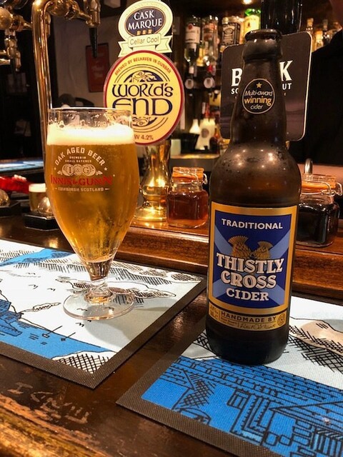 元世界の果かぁ。St.Andrew's Cross. 恰好良いビア樽。カウンターに沿ってタップが並んでます。cool. 雰囲気が有ります。角子テーブルのソファー席。Sarsons モルトビネガー、...