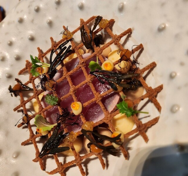 オーソドックスなフレンチにも見えるが、ウィスキーに関連した素材と馴染みの少ない食材を使い、見た目以上に複雑な味わい。