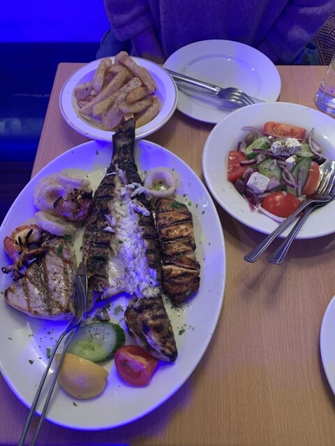 スターターはギリシャ料理の定番。メインは予想通りラージポーションだが、Sea bass・tuna・salmonのグリルがジューシー且つ塩加減が丁度良く、難なく完食。