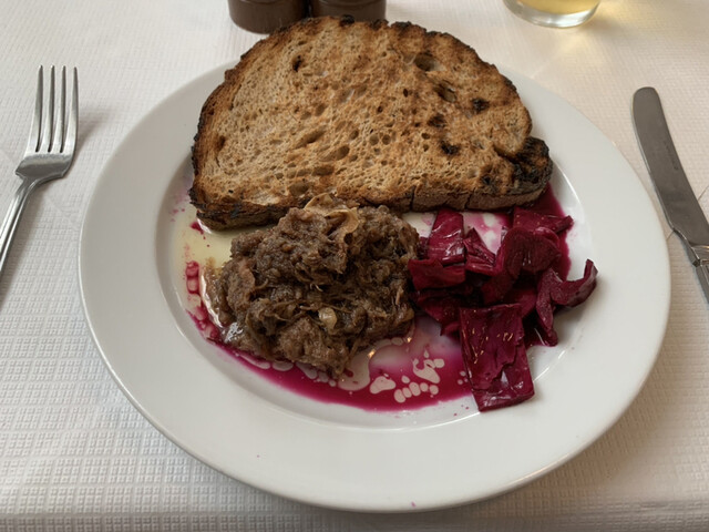 食肉市場近くのいい意味ガチャついた星付レストラン、かつての燻し工場をレストラン・バーに改装しています。15時まで営業で、ギリ14:45オンライン予約。名物のローストマンガリッツァ豚売切(>_<) テキトーにビーフとタラオーダー、まずまずの旨さ、なぜかタラの注文通ってなかった(>_<)