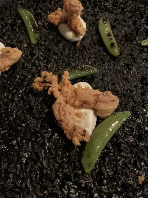 豊富なラインナップ(12種類)からお勧めの「Txangurro rice」をオーダー。バスク地方の名物のカニの煮込みを使用しており泡状のキムチがアクセント。