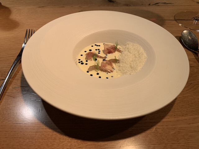 BTタワー近くの2つ星。18:00時間厳守とあって15分前来ましたが、シャンパン2杯と小皿、バーで50分ほど強制まったり、今回ワインペアリングはお高いので、Rhôneのボトルにしました。メインはU型カウンター形式、ゲストと同数のスタッフで週休2日の1回転、お高いのも仕方ないですね。接客は抜群、お料理もまずまず、ただ3時間経過しても終わらず、4時間コース。列車の時間あるので途中退席、明日移動日が鉄道ストにブチ当たり前日移動でロンドン市内ホテル代1泊分パー(>_<)