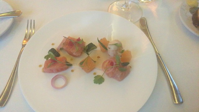 Salmon, langoustine, melon, calamansi