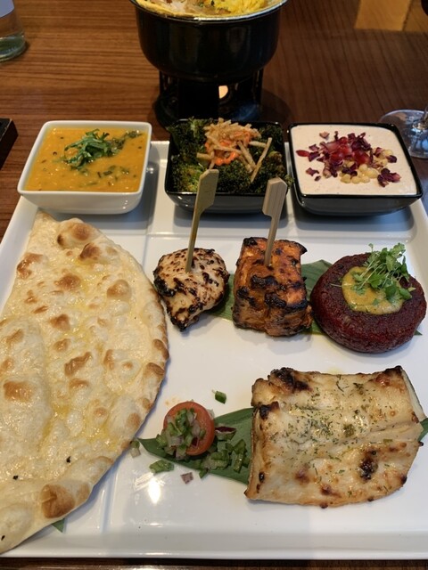 Platterはブラックペッパーチキンティッカ、シーバスのグリルなどがワンプレートで楽しめる。洗練されたチキンビリヤニは一つ星ならではのクオリティ。
