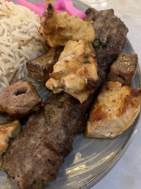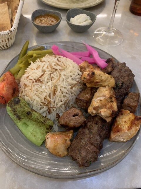 中東料理のクオリティの判断基準としているMixed Grill(Chicken cubes、Lamb cubes、Minced lamb)とグラスの赤ワインをいただいた。