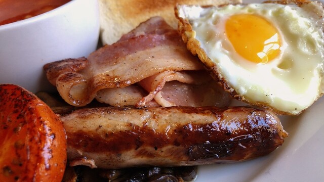 ソーセージ、しめじのソテー、ハッシュドポテト