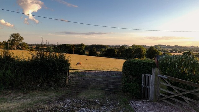 夕日の眺め 牧草地帯や古い建築を見ながら