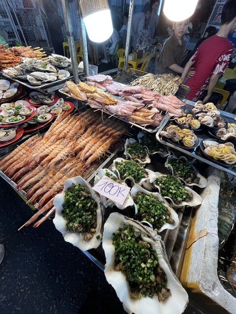 フーコック島の有名なナイトマーケットへ訪問。通りを歩いていると美味しそうなシーフードBBQ屋さんを発見。値札が置いてあって明朗会計そうだったため訪問。ウニとホタテのBBQ焼きを注文。ウニは日本のウニと...