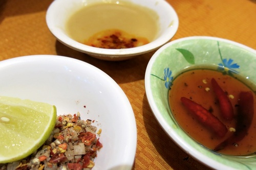 並べられたタレをつけていただきます 私はスパイスの効いた塩にライムを絞った調味料が一番好きです