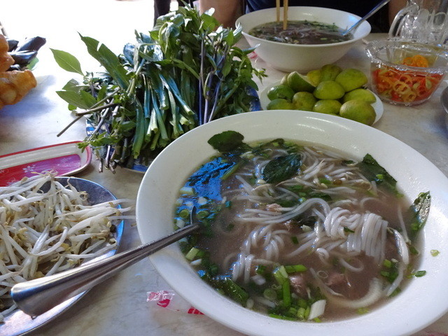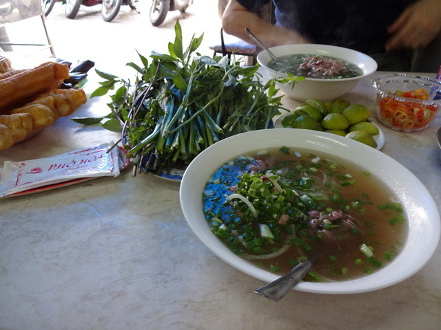 テーブルには、香草、ライム、唐辛子、揚げパン(クアイ)、