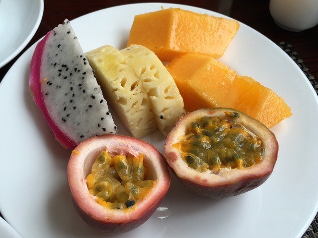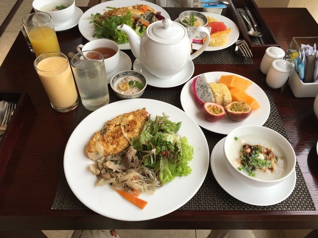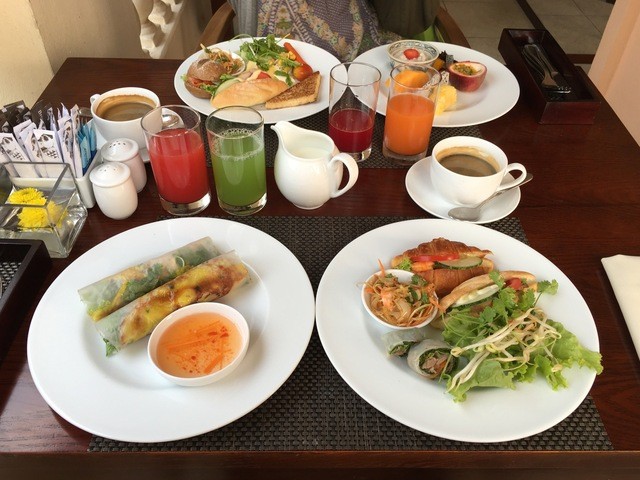 2日目の朝食。手前左のお皿がベトナム風パンケーキだそうですが、春巻きだーねー