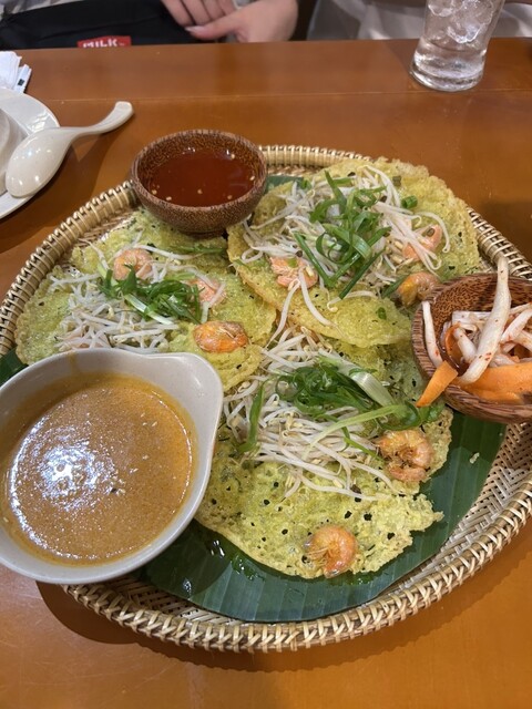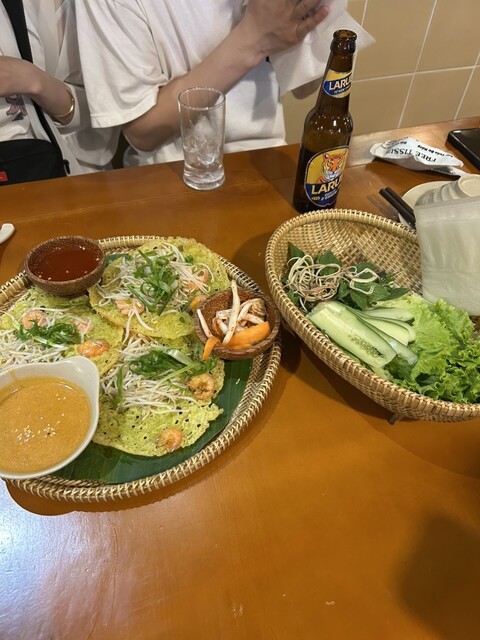鉄板から立ち上る香りにまずやられる。パリパリ生地の中に、海老・もやし・豚肉がぎっしり。ハーブと一緒に巻いて、ヌクチャムでパクリ。軽く感動レベル。