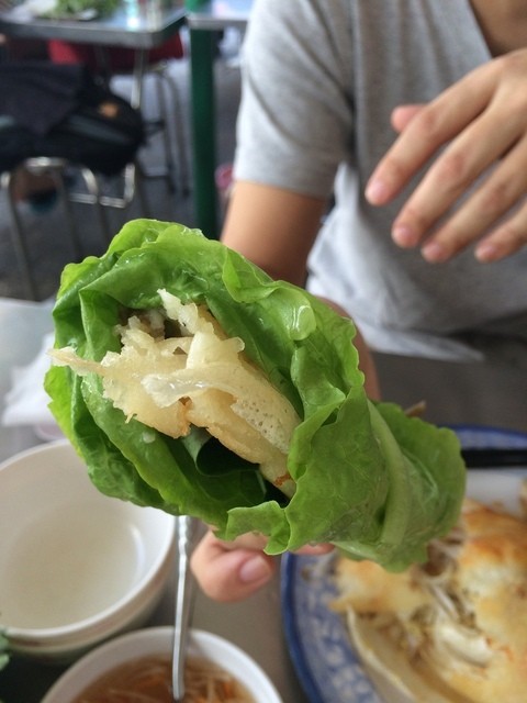 たっぷりのもやしと海老の入ったバインセオを大きなハーブに巻いて食べますが、意外をあっさりしていて食べやすく、最初は大きなーと思いましたが、あっという間に食べてしまいました。
