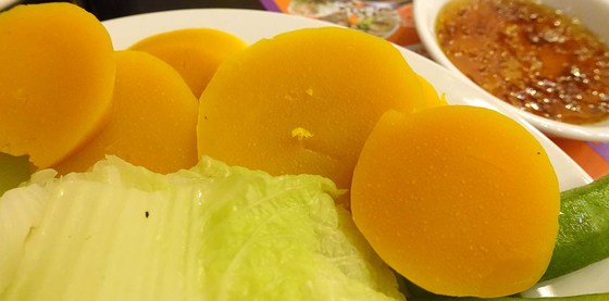 蒸し野菜はこのタレで食べます。甘くて辛いチリソースベースで何か入っているような気がします・・・