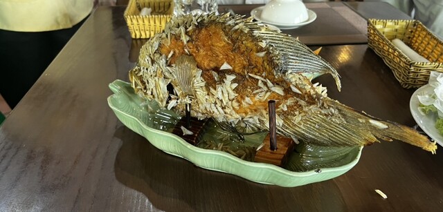 天井の高い開放的な空間に案内され着席。ここから間髪入れず料理が運ばれます。汁もの、ライス、揚げ春巻きなどなど。メインディッシュはデカ魚のフライ。一発目は横に待機していたマダムインストラクター様がライスペーパーティーチャーに。しかし、テーブルに鎮座するデカ魚、薄目で見たらデカ魚のマゴットまぶし、に見える。揚げた鱗はパリパリと美味しいですが、ねぇ。。。