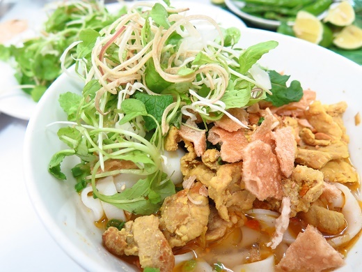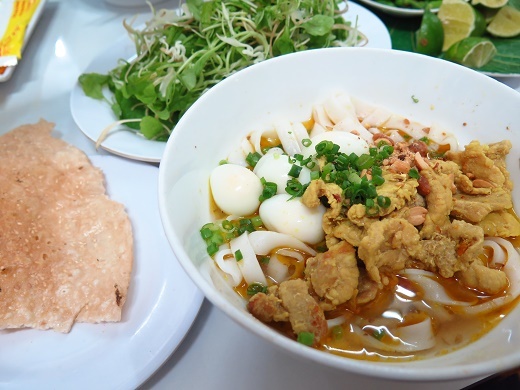 きしめんのような平打ち麺に鶏モツやピーナッツなどのトッピング