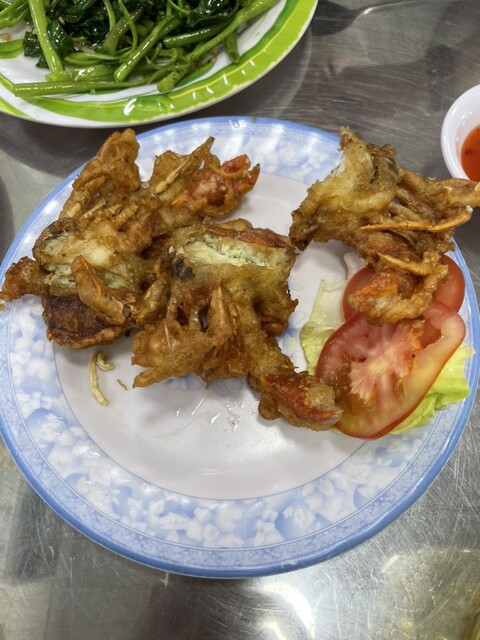 カニチャーハン、空芯菜の炒め物、シェルクラブの唐揚げ、何だかわからない大きなカニの蒸し物を食べました。
