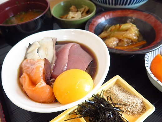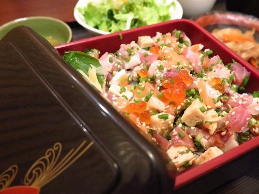 まぐろ・たこ・いか・たまごを細かく刻んで四角のお重に