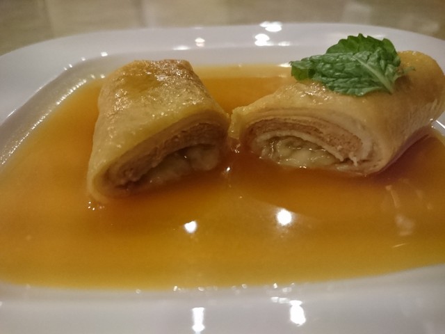 バナナのクレープにオレンジソースがかかり、柔らかく甘酸っぱい。