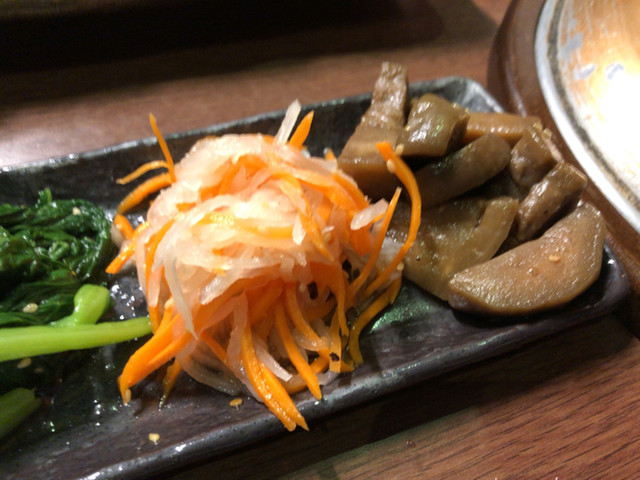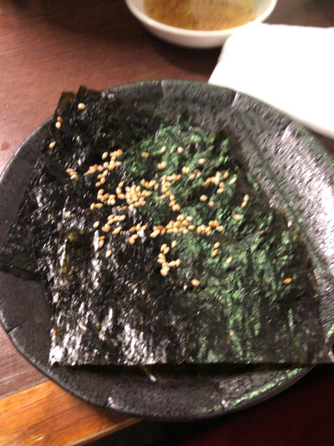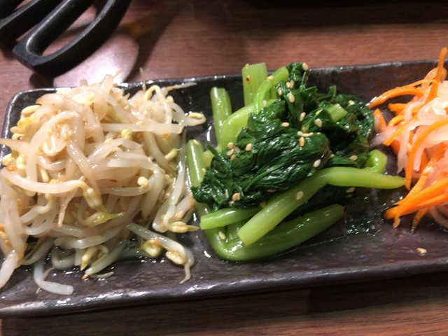 ありきたりですが、上ロース2つ、タン1つ、豚ハラミ1つ、野菜盛り合わせ1つ、サンチュ、焼き枝豆、韓国海苔、ナムル盛り合わせを注文。