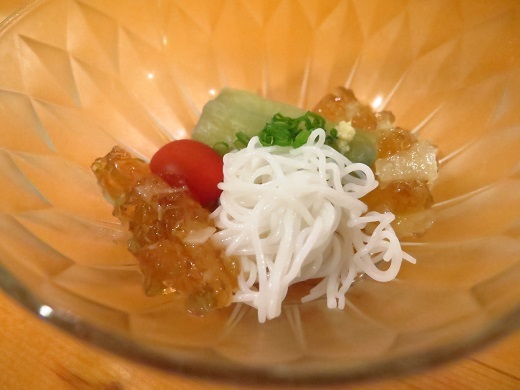 揚げ茄子とフーティウ麺 玉葱ジュレ