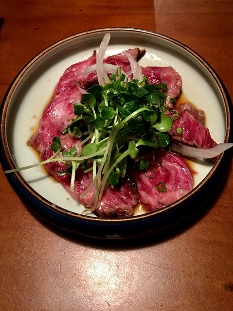 和牛のたたきも、そこそこ美味しい。うちのベトナム人スタッフは生のニンニクをかじりながら食べていた。(笑
