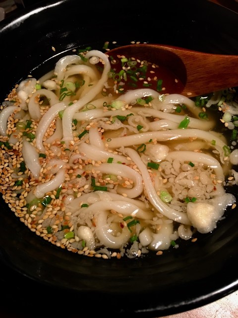 締めは讃岐うどんのかけとぶっかけ、うどんは自家製だそう。コシも強くて良かったが、もう少しもっちり感があると嬉しいな。ぶっかけのライムは苦味が出て合わないと思うけど。