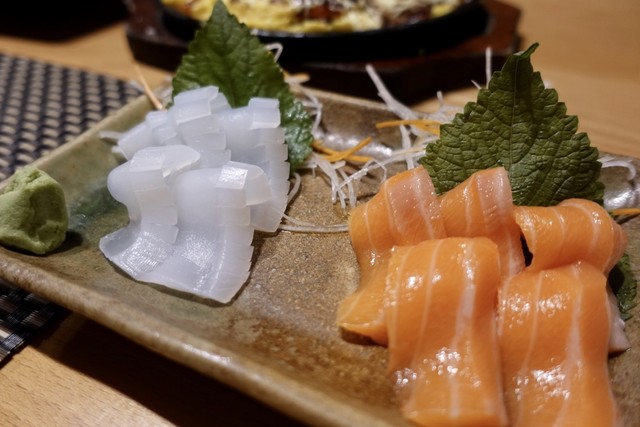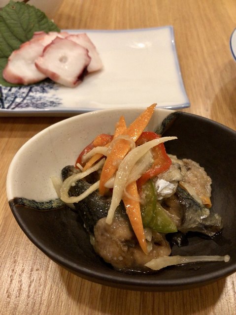 刺身盛り合わせはマグロ(キハダ)、タコ、アジ(美味しい)。