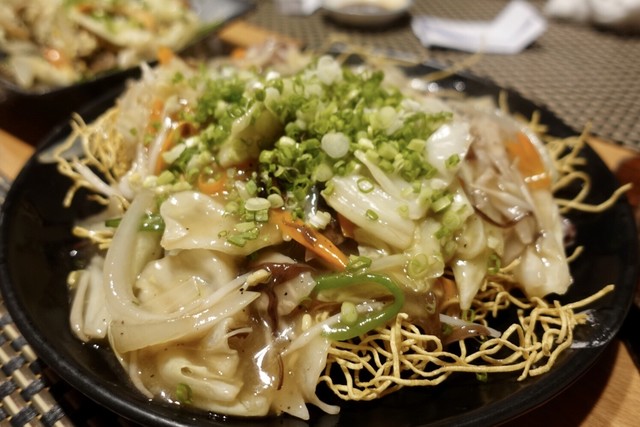 皿うどんの麺は縮れも強くて変わっていて初めて見るタイプ。食感も面白く美味しい。