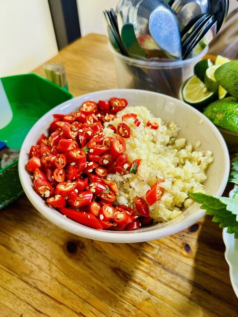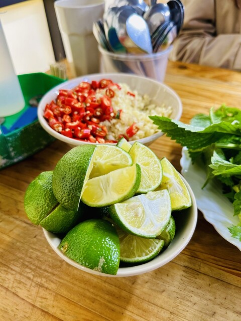 先ずはスープから〜今一歩、味が決まっていなく薄い味わい!イマイチな出汁感を補う為に、卓上にある無料の「刻みニンニク」と「唐辛子」や「ライム」を自分好みにしてね!そして、今度は「ブン」と呼ばれる米粉麺を浸しモグモグと食すが、更にスープが薄くなり「ブンチャー」の美味しさが理解不能?トッピングには、炭火焼きの豚肉団子がたくさん!これは肉肉しく美味しいかった。