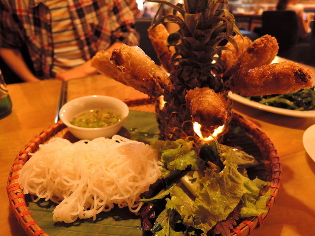 揚げ春巻きは、パイナップルをくり抜いたランタンに刺...
