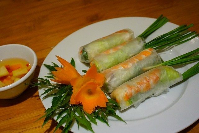 海老が丸ごと入った生春巻きは甘酸っぱいタレにダイブさせる。