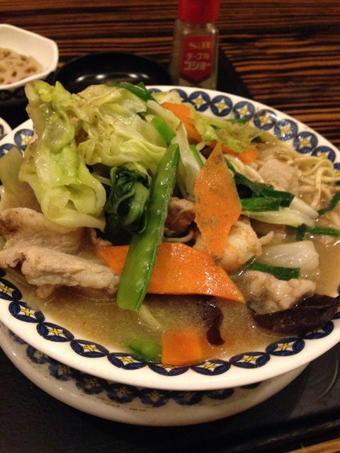 ちゃんぽんは豚肉、キャベツ、にんじん、木耳、さやえんどう、イカなどが