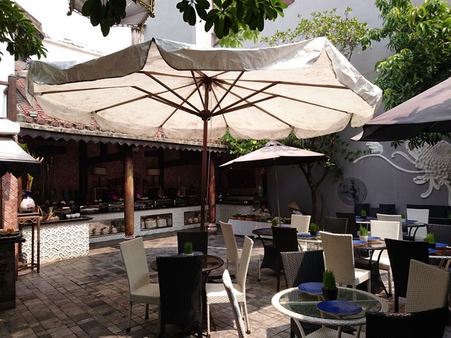 ビュッフェ形式でテラスにお料理が並んでいて、デザートは店内、焼き物はその場で焼いて持ってきてくれます。