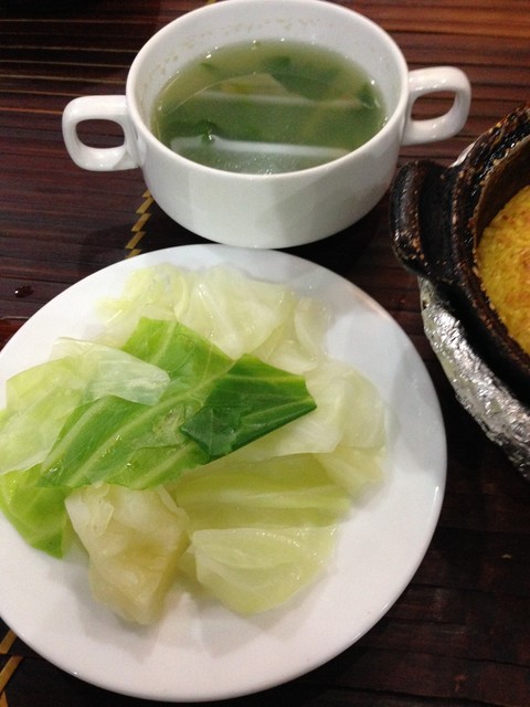 それに、茹でたキャベツ、スープ、ごはんが付いてきます。