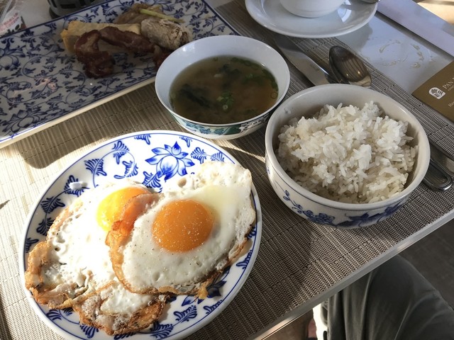 こちらの朝食もなかなか美味しい。目玉焼きに白メシに味噌汁。そして〆にフ...