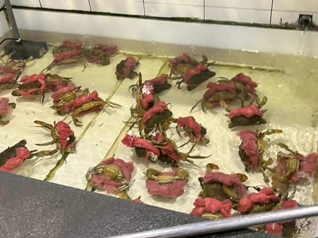 しゃこは巨大で美味い、こんなしゃこははじめてだスタッフがハサミで切ってくれた、サービスも良い
