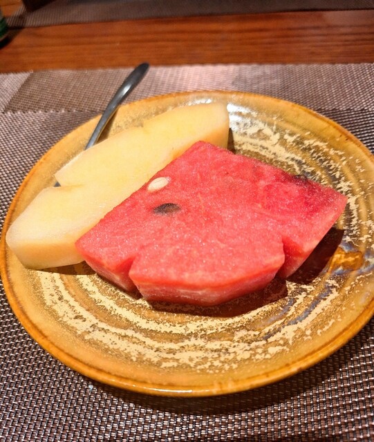 デザートはスイカとメロンの盛り合わせとグリーンティーでさっぱりと締め。