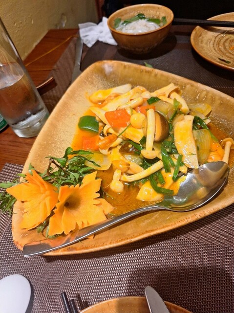 メインはブンチャー(焼き豚と生米麺)と海老の玉ねぎときのこ炒め、さらに季節の野菜炒めとパンダンリーフ香るご飯が付いていてボリュームも満点。