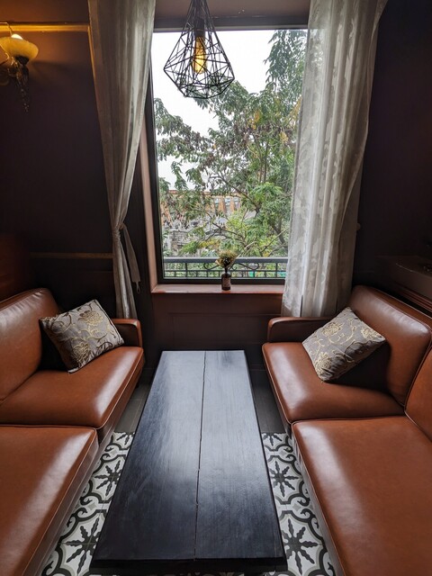 ハノイの観光名所のひとつ「ロンビエン橋」を一望できる穴場カフェ。ホテルのようなエントランスで、店内もシックなラウンジといった雰囲気。ややアッパーな気配があり、隣のボックスシートではモデル(?)の撮影前のメイク場所としても使われていました。