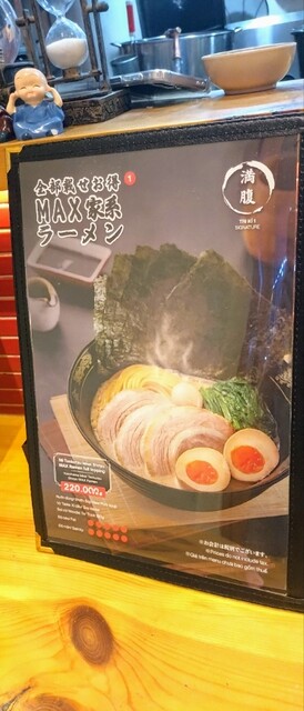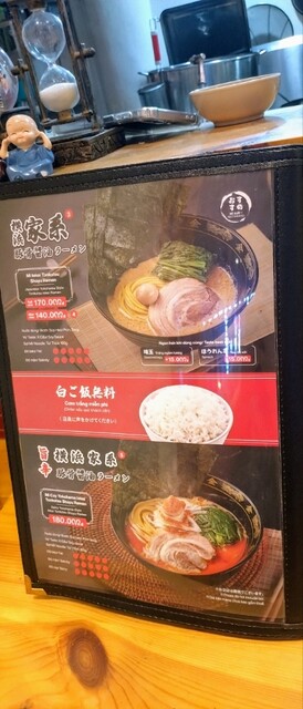フルトッピングのMAX家系ラーメン237600VNDは、日本円に換算すると約1430円ぐらい。ベトナムの外食物価は日本の1/3ぐらいなので、4300円ぐらいの感覚です _φ(・_・ 日本のラーメンは高級料理になる感じですね。