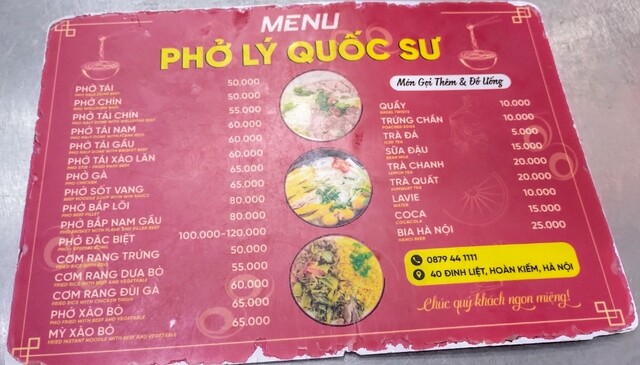 ハノイ初日、ホテルにチェックインしたのが22時過ぎで、大半の飲食店が閉店している時間帯。夕食に何か食べたいなと中心部をうろついて、ホアンキエム湖までやってきて、更に一本道を入った所に営業しているお店を発見!おっ!?フォーのお店じゃないですか、ハノイ1食目に丁度良いじゃないの。そのままお店に入り、メニューから注文。後客2名で閉店準備していました。滑り込みセーフ _φ(・_・