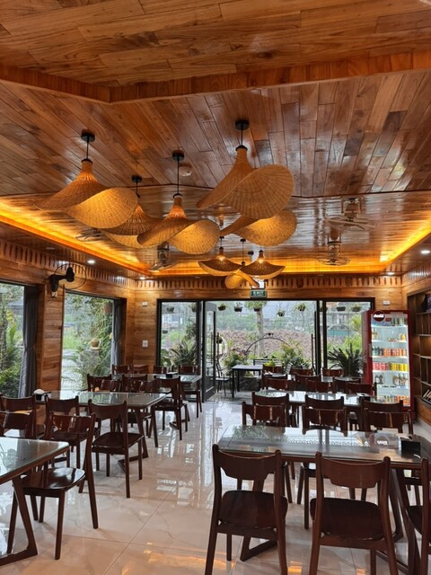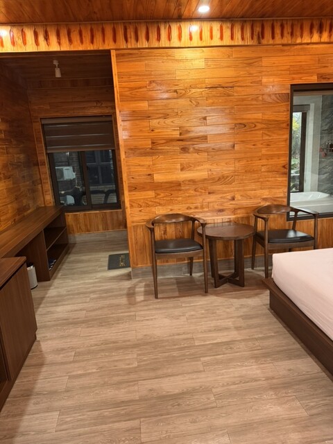 外観は森に囲まれた山小屋のような造り、内装はログハウスの様な木をのぬくもりを感じる宿
