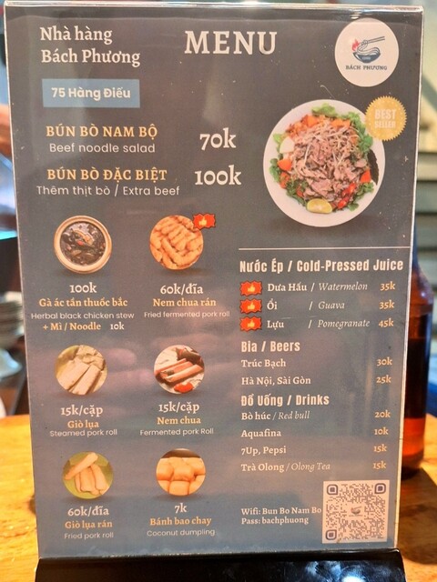 ハノイ旧市街の中心にある人気の『Bộ Bún Bò Nam Bộ Bách Phương』で、名物のBún Bò Nam Bộ (ブンボーナンボー) をいただきました。